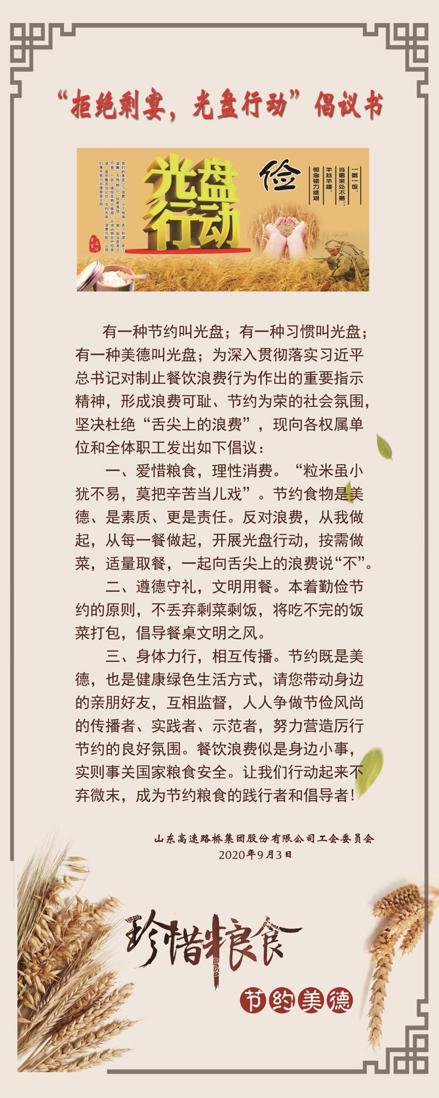 為貫徹落實(shí)習(xí)近平總書記制止餐飲浪費(fèi)的指示精神,路橋股份全體職工誓將“厲行勤儉節(jié)約,反對鋪張浪費(fèi)”的倡議深入開展。